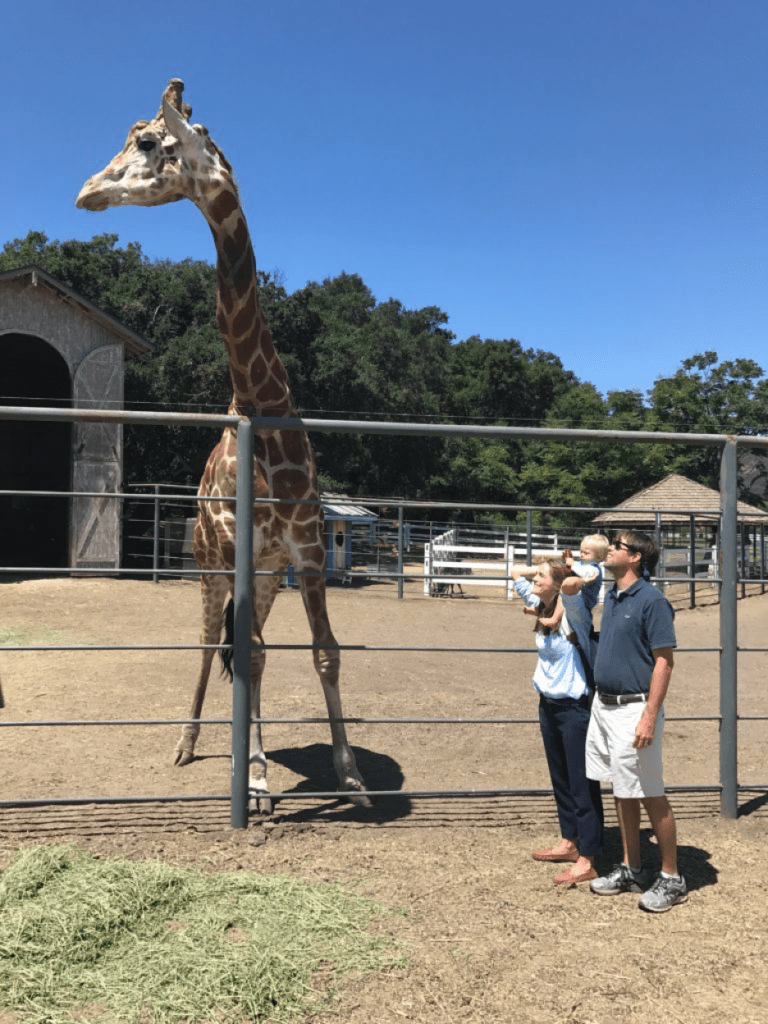 In summation, it was a good week. I learned a lot. Hopefully you learned a little just reading this, too, and, hopefully you believe it. I sadly was so “in the moment” the whole week that I never thought to ask if anyone could take a picture of me with “Dr. Stu.” for evidence. However, he did take pictures of me, my husband, and my baby with actor Stanley the Giraffe, who lives on the same ranch as the doctor’s horses. I’m posting one below, since it’s what I’ve got, and since it was a fun memory. Maybe missing a photo with him will be my excuse to return in the future. Mainly, though, I’d like to go back to learn more. Few doctors, as far as I can tell, are teaching the obstetrical skills that Dr. Fischbein has mastered, so I feel blessed that I could be privy to some of his knowledge. Better still, I feel blessed to have come to know someone whose work is carried out with conviction in a world where, at least on the labor and delivery wing, liberty and the pursuit of happiness are sort of forgotten sometimes. But not by all. Thank you, Dr. Stu.